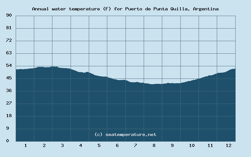 The average annual water temperature in Argentinean Sea in Puerto de Punta Quilla is 8°C (46°F). In August, the water reaches its lowest point of the year at 2°C (36°F), while in January, it peaks at 15°C (59°F). In Puerto de Punta Quilla, the water temperature in the Argentinean Sea never consistently reaches a comfortable level for swimming in any month.