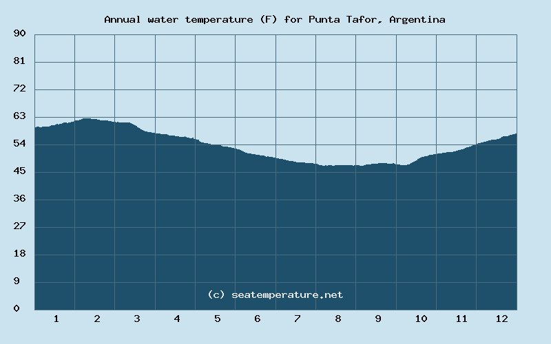 The water temperature in the Argentinean Sea in Punta Tafor during the winter ranges from 10°C to 19°C (50°F to 66°F).