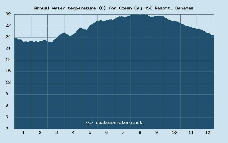 You can explore detailed data on how the water temperature in Ocean Cay MSC Resort varies each month: