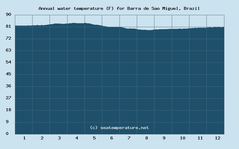 According to our forecast, the sea temperature in Barra de Sao Miguel will remain nearly unchanged in the coming days, its value will be 80°F.