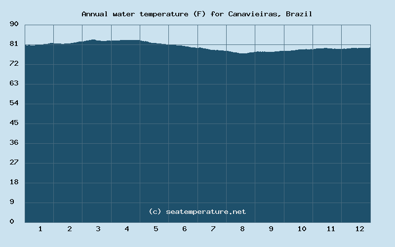 Throughout the year, the sea temperature in Canavieiras is always above 64°F (18°C), the sea temperature exceeds 72°F (22°C) for 366 days, and exceeds 77°F (25°C) for 343 days.