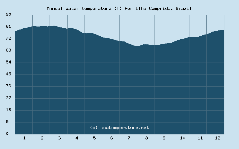 Throughout the year, the sea temperature in Ilha Comprida is always above 64°F (18°C), the sea temperature exceeds 72°F (22°C) for 239 days, and exceeds 77°F (25°C) for 131 days.