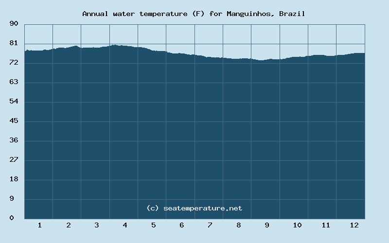 Throughout the year, the sea temperature in Manguinhos is always above 64°F (18°C), the sea temperature exceeds 72°F (22°C) for 366 days, and exceeds 77°F (25°C) for 141 days.