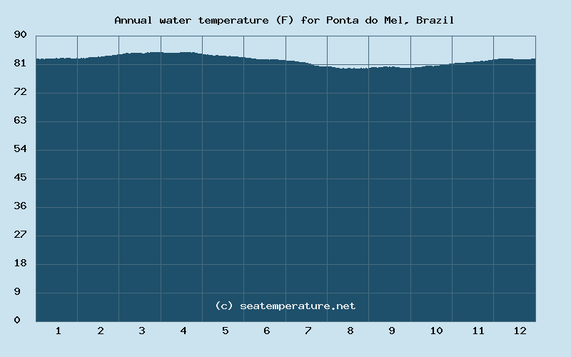 Throughout the year, the sea temperature in Ponta do Mel is always above 64°F (18°C), the sea temperature exceeds 72°F (22°C) for 366 days, and exceeds 77°F (25°C) for 366 days.