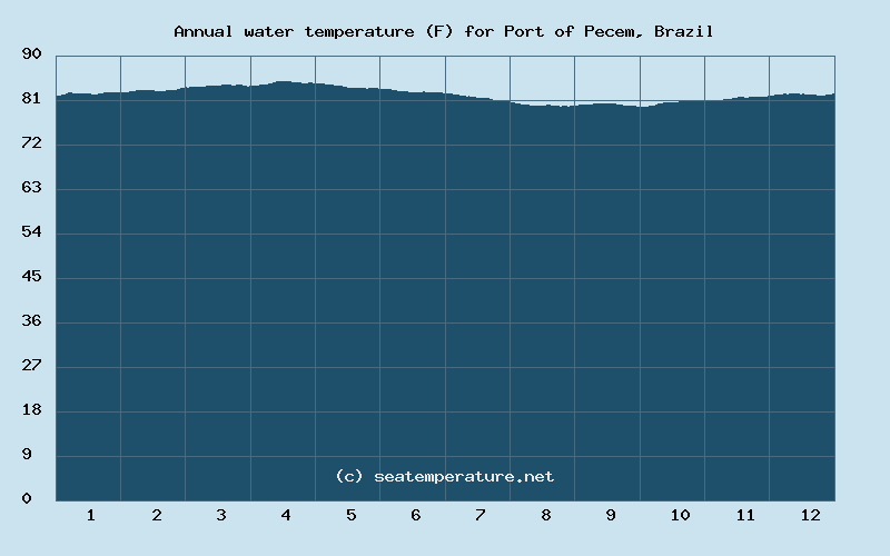 Today sea water temperature in the Atlantic Ocean in Port of Pecem is 26.1°F. This is very warm water, allowing for extended stays without any discomfort. Swimming in these conditions will be particularly enjoyable, making it the ideal temperature range for those who want to relax in the sea. Additionally, water in this temperature range is suitable for children and elderly people, as it is comfortable for prolonged stays.