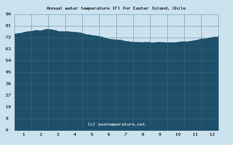 Throughout the year, the sea temperature in Easter Island is always above 64°F (18°C), the sea temperature exceeds 72°F (22°C) for 181 days, and exceeds 77°F (25°C) for 42 days.