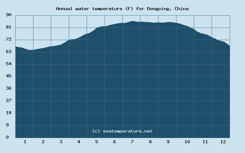 Throughout the year, the sea temperature in Dongping exceeds 77°F (25°C) for 184 days, exceeds 72°F (22°C) for 254 days, and exceeds 64°F (18°C) for 354 days.