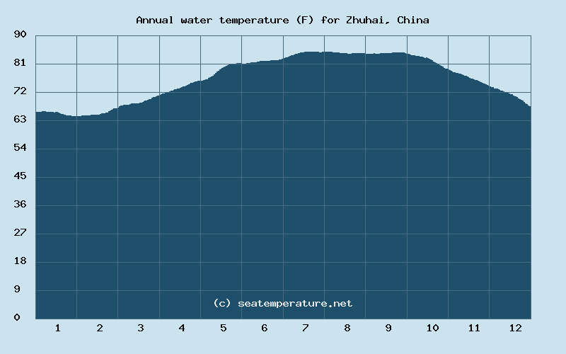 Throughout the year, the sea temperature in Zhuhai exceeds 77°F (25°C) for 185 days, exceeds 72°F (22°C) for 250 days, and exceeds 64°F (18°C) for 344 days.