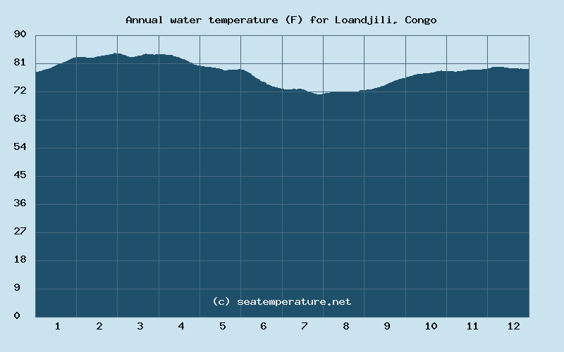 Throughout the year, the sea temperature in Loandjili is always above 64°F (18°C), the sea temperature exceeds 72°F (22°C) for 336 days, and exceeds 77°F (25°C) for 245 days.