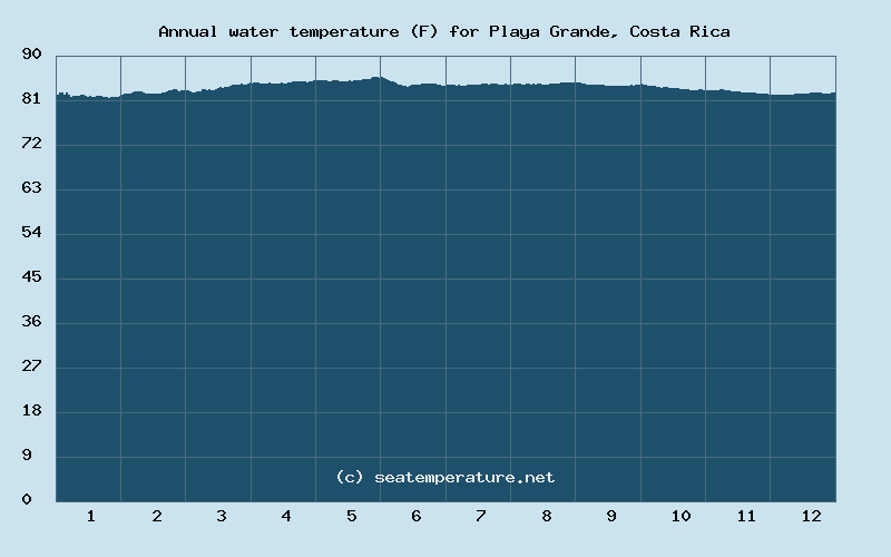 Throughout the year, the sea temperature in Playa Grande is always above 64°F (18°C), the sea temperature exceeds 72°F (22°C) for 366 days, and exceeds 77°F (25°C) for 366 days.