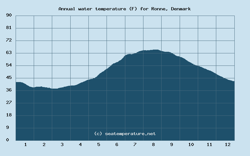 Throughout the year, the sea temperature in Ronne exceeds 77°F (25°C) for 0 days, exceeds 72°F (22°C) for 0 days, and exceeds 64°F (18°C) for 32 days.