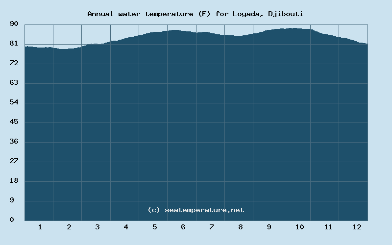The water temperature in the Gulf of Aden in Loyada during the summer ranges from 28°C to 33°C (82°F to 91°F).