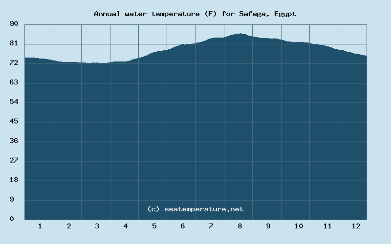 Throughout the year, the sea temperature in Safaga is always above 64°F (18°C), the sea temperature exceeds 72°F (22°C) for 359 days, and exceeds 77°F (25°C) for 202 days.
