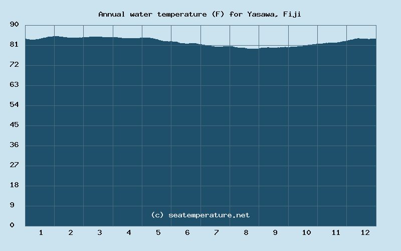 Below is the annual chart of sea temperature changes in the Fiji Sea in Yasawa.