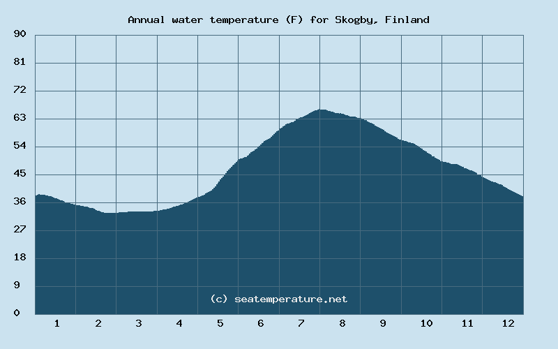 The water temperature in the Gulf of Finland in Skogby during the winter ranges from -1°C to 8°C (30°F to 46°F).