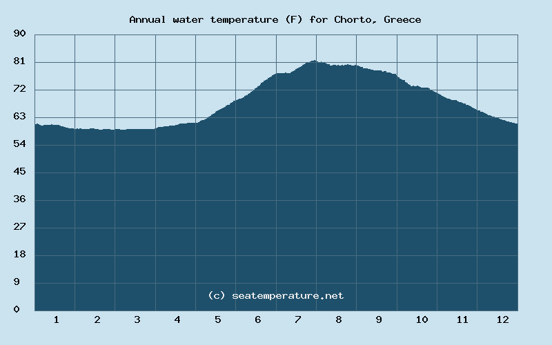 Throughout the year, the sea temperature in Chorto exceeds 77°F (25°C) for 79 days, exceeds 72°F (22°C) for 130 days, and exceeds 64°F (18°C) for 202 days.