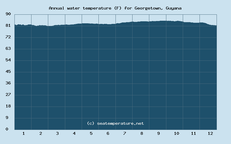 On this page, you will find comprehensive information about the sea temperature in Georgetown in Guyana, including current readings, historical data and trends, monthly averages, as well as weather forecasts and upcoming temperature predictions. We find every spot where you can swim and tell you what the water temperature is there today and throughout the year.