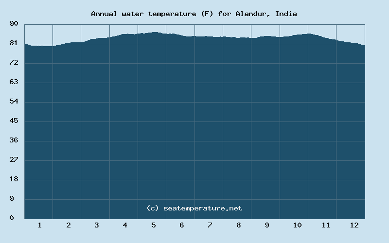 The water temperature in the Bay of Bengal in Alandur during the summer ranges from 26°C to 31°C (79°F to 88°F).