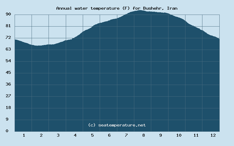 Throughout the year, the sea temperature in Bushehr is always above 64°F (18°C), the sea temperature exceeds 72°F (22°C) for 260 days, and exceeds 77°F (25°C) for 214 days.