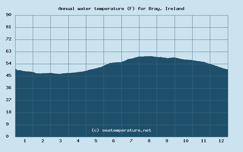 The water temperature in the Irish Sea in Bray during the winter ranges from 7°C to 13°C (45°F to 55°F).