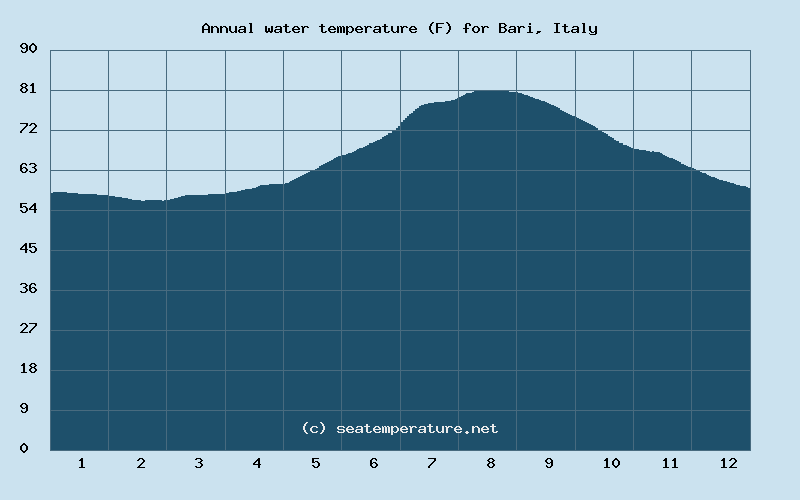 The water temperature in the Adriatic Sea in Bari during the winter ranges from 12°C to 18°C (54°F to 64°F).