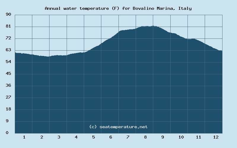 The water temperature in the Ionian Sea in Bovalino Marina during the winter ranges from 13°C to 20°C (55°F to 68°F).