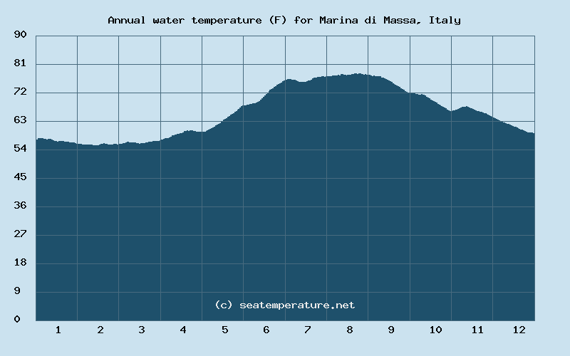 The water temperature in the Tyrrhenian Sea in Marina di Massa during the winter ranges from 11°C to 18°C (52°F to 64°F).