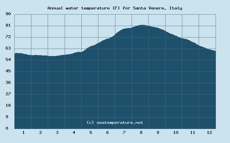 The water temperature in the Ionian Sea in Santa Venere during the winter ranges from 12°C to 20°C (54°F to 68°F).
