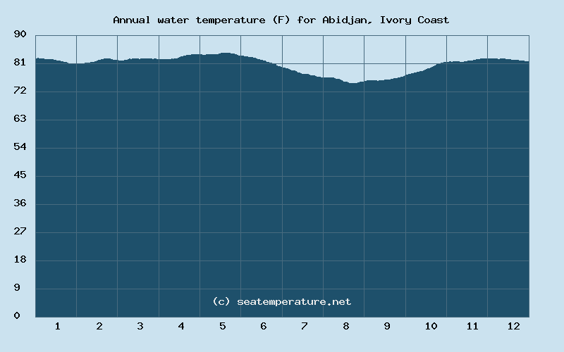 The water temperature in the Gulf of Guinea in Abidjan during the summer ranges from 21°C to 30°C (70°F to 86°F).