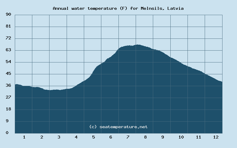Today sea water temperature in the Baltic Sea in Melnsils is 10.3°F. This is still cool water, suitable only for experienced swimmers or those accustomed to cold water. Swimming in such conditions is possible, but not recommended for prolonged periods. Extra caution should be taken during extended exposure, as the cold water can cause heat loss and lead to hypothermia. For added comfort, special clothing can be used.