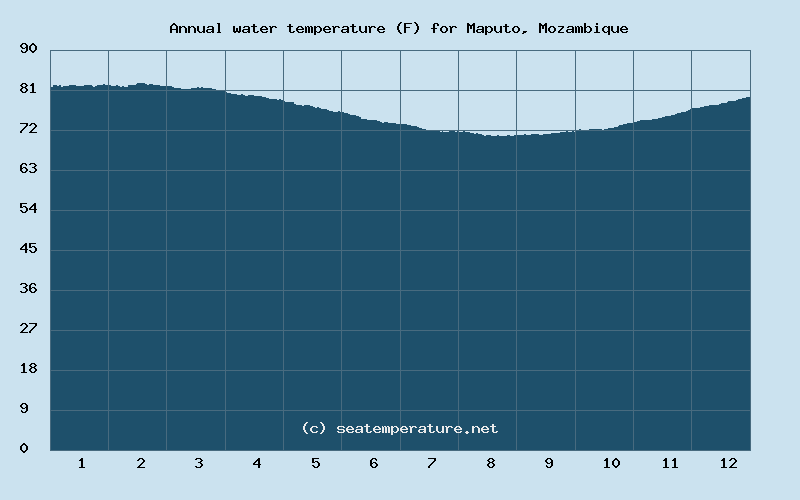 Throughout the year, the sea temperature in Maputo is always above 64°F (18°C), the sea temperature exceeds 72°F (22°C) for 290 days, and exceeds 77°F (25°C) for 156 days.