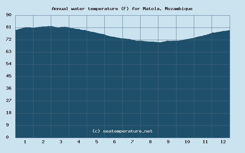 Throughout the year, the sea temperature in Matola is always above 64°F (18°C), the sea temperature exceeds 72°F (22°C) for 281 days, and exceeds 77°F (25°C) for 163 days.