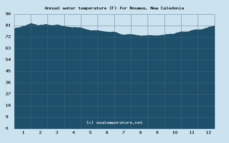 Throughout the year, the sea temperature in Noumea is always above 64°F (18°C), the sea temperature exceeds 72°F (22°C) for 366 days, and exceeds 77°F (25°C) for 189 days.