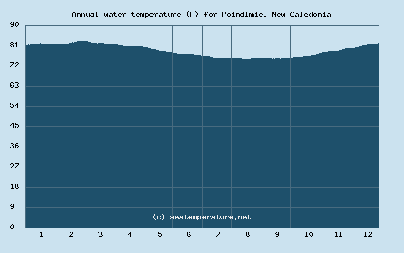 Below is the annual chart of sea temperature changes in the Coral Sea in Poindimie.