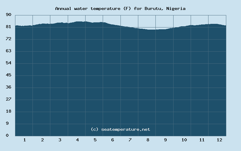 The water temperature in the Gulf of Guinea in Burutu during the winter ranges from 26°C to 30°C (79°F to 86°F).