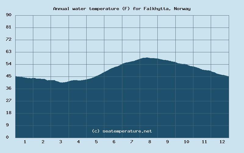The water temperature in the Norwegian Sea in Falkhytta during the summer ranges from 7°C to 17°C (45°F to 63°F).
