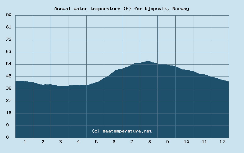 The water temperature in the Norwegian Sea in Kjopsvik during the summer ranges from 5°C to 16°C (41°F to 61°F).