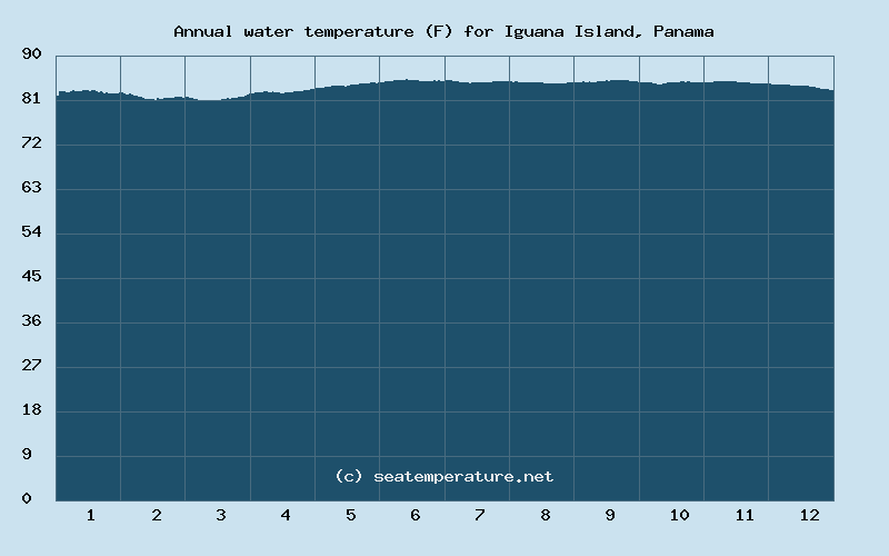 Throughout the year, the sea temperature in Iguana Island is always above 64°F (18°C), the sea temperature exceeds 72°F (22°C) for 366 days, and exceeds 77°F (25°C) for 366 days.