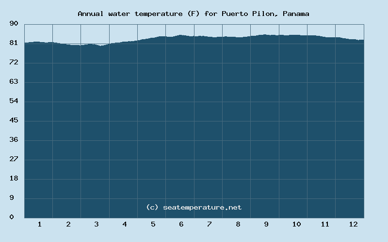 The average annual water temperature in Caribbean Sea in Puerto Pilon is 82°F (28°C). In March, the water reaches its lowest point of the year at 75°F (24°C), while in June, it peaks at 88°F (31°C). The water temperature in the Caribbean Sea in Puerto Pilon is comfortable for beach vacations and swimming year-round.