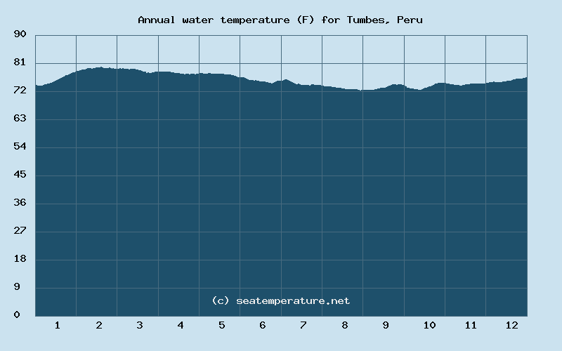 Throughout the year, the sea temperature in Tumbes is always above 64°F (18°C), the sea temperature exceeds 72°F (22°C) for 358 days, and exceeds 77°F (25°C) for 107 days.