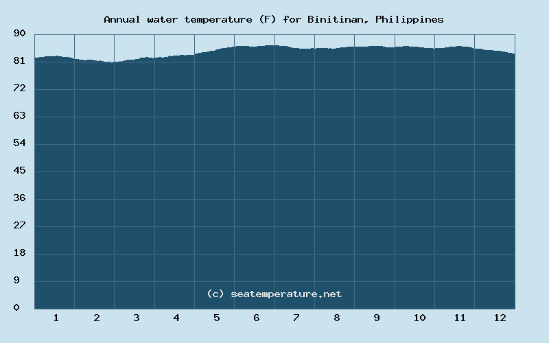 According to our forecast, the sea temperature in Binitinan will remain nearly unchanged in the coming days, its value will be 86°F.