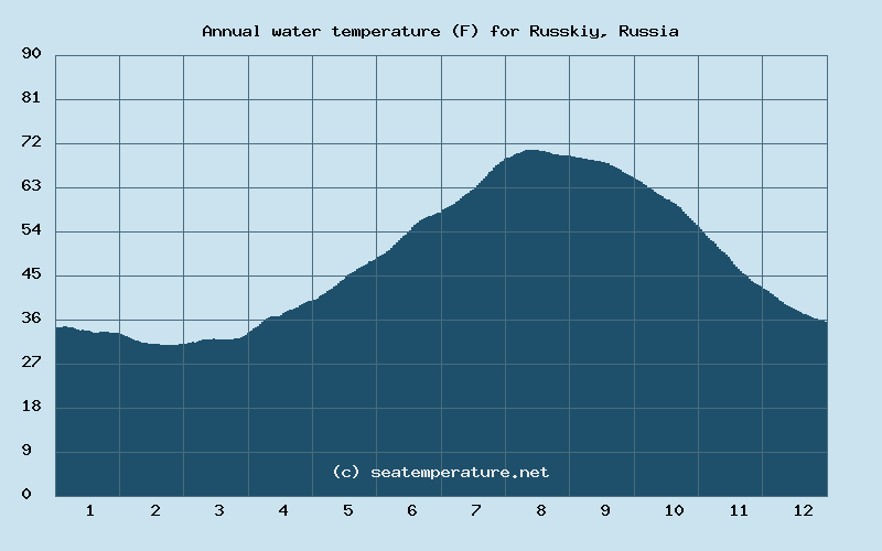 You can explore detailed data on how the water temperature in Russkiy varies each month: