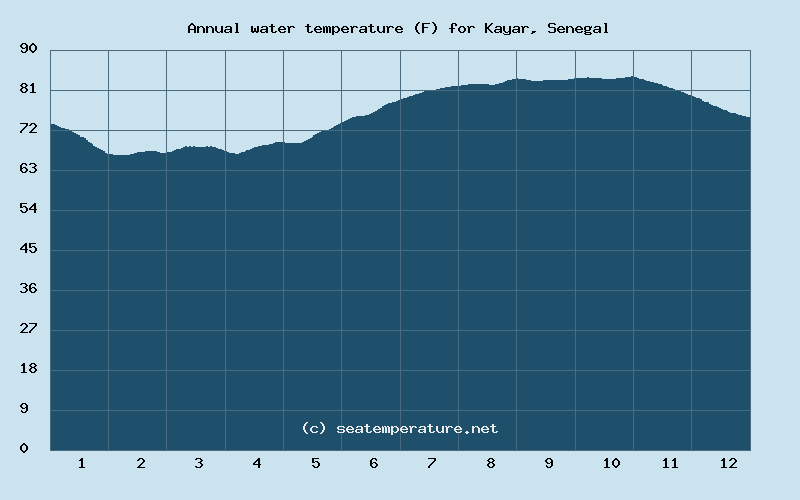 The water temperature in the Atlantic Ocean in Kayar during the summer ranges from 21°C to 30°C (70°F to 86°F).