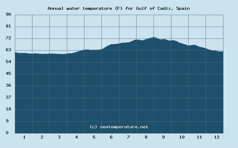 Throughout the year, the sea temperature in Gulf of Cadiz exceeds 77°F (25°C) for 0 days, exceeds 72°F (22°C) for 23 days, and exceeds 64°F (18°C) for 177 days.