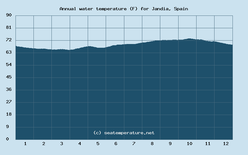 Throughout the year, the sea temperature in Jandia is always above 64°F (18°C), the sea temperature exceeds 72°F (22°C) for 70 days, and exceeds 77°F (25°C) for 0 days.