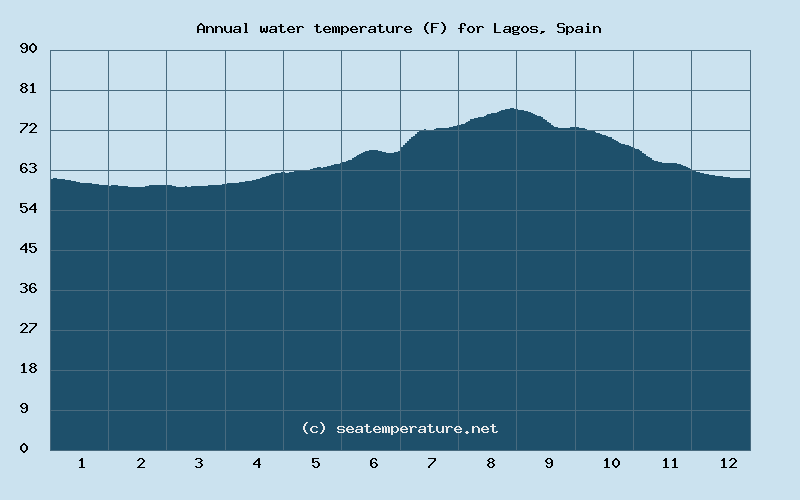 The water temperature in the Alboran Sea in Lagos during the summer ranges from 17°C to 27°C (63°F to 81°F).