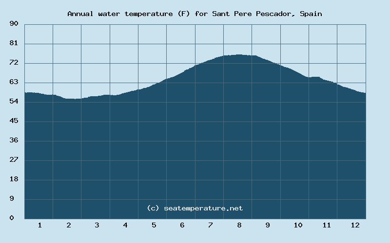 Throughout the year, the sea temperature in Sant Pere Pescador exceeds 77°F (25°C) for 0 days, exceeds 72°F (22°C) for 80 days, and exceeds 64°F (18°C) for 165 days.