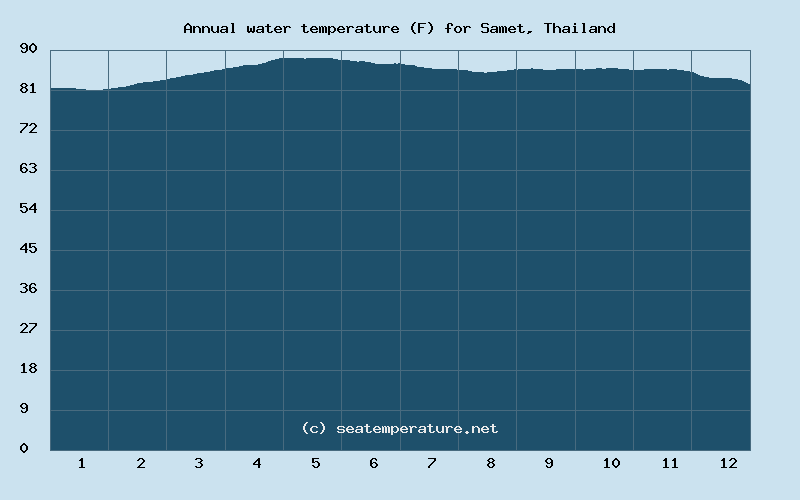 The water temperature in the Gulf of Thailand in Samet during the summer ranges from 28°C to 32°C (82°F to 90°F).