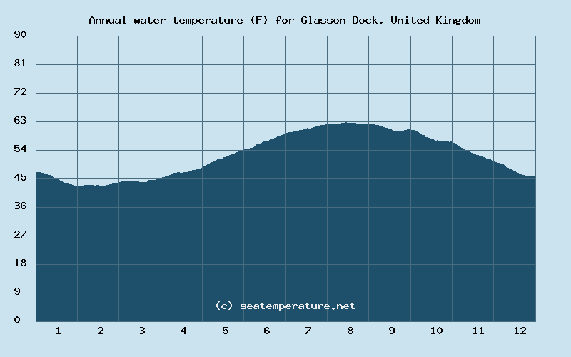Throughout the year, the sea temperature in Glasson Dock never exceeds 64°F (18°C).
