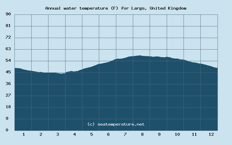 The water temperature in the North Sea in Largs during the winter ranges from 5°C to 12°C (41°F to 54°F).